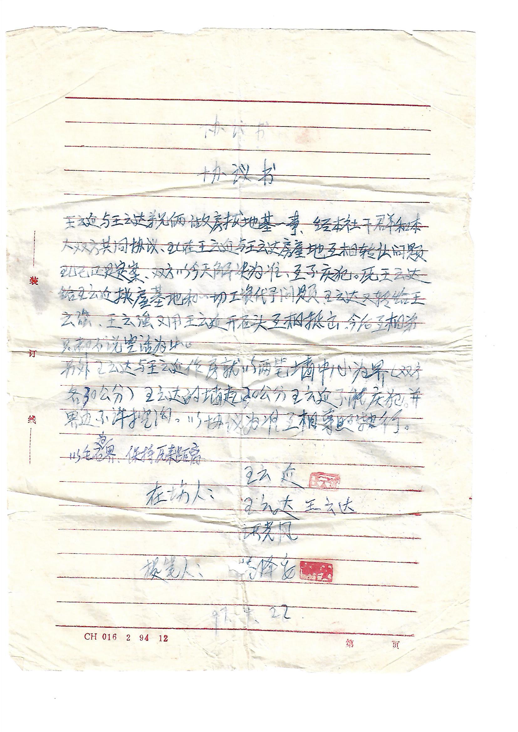 王云建与王云达亲兄俩做房拨地基一事,经本社干群和本人双方共同协议,现在王云建与王云达房屋地互相转让问题现已还是定案.双方以今天解决为准,互不侵犯。原王云达给王去建挑屋基地和一切工资待遇问题王云达又转给王云强、王云強又用王云建开石头互和抵击,今后互相亲兄弟不说空话为止。